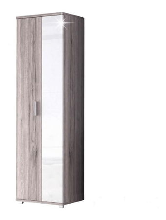 Šatní skříň dvoudveřová primárně určená do předsíně v provedení dub canyon v kombinaci s bílými levými dveřmi v extra vysokém lesku high gloss. Uvnitř se nachází věšáková tyč, která je pod horní poličkou, která má maximální nosnost 5kg.