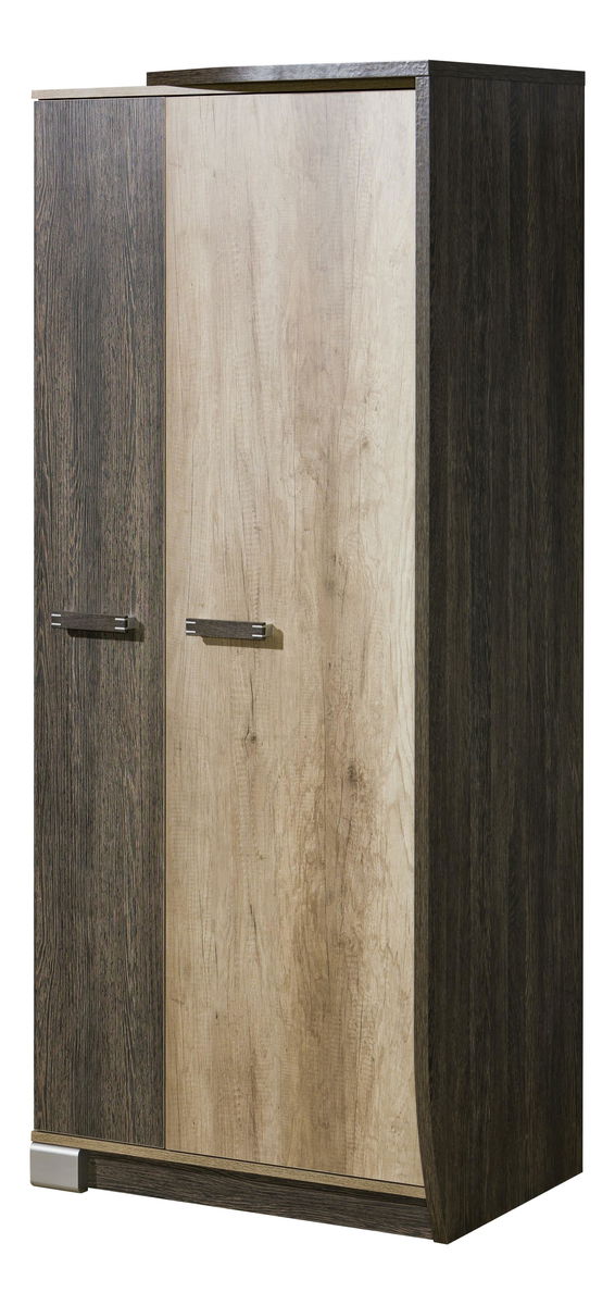 ZobrazitŠatní skříň Roverdon R1 kombinuje 2 odstíny v netradičním designu. Skříň je vhodná na kabáty a delší oblečení se hodí do předsíně nebo šatníku, ale i do ložnice. I když jde o dvoudveřový model, dveře jsou nesymetrické - jedno křídlo je širší než druhé - a proto je k dispozici levé i pravé provedení.