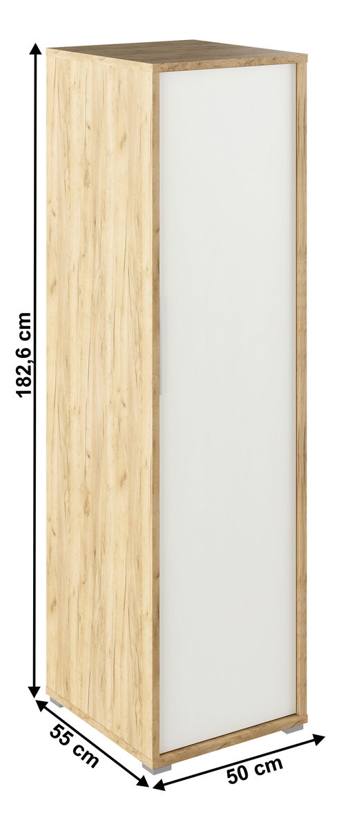 Věšáková skříň Rumia 20 (dub artisan + bílá) o výšce 182,6 cm, šířce 50 cm a hloubce 54,5 cm, je ideálním řešením pro uskladnění vašich věcí. Tato skříň nabízí dostatek prostoru pro věšení vašich obleků a kabátů, zatímco na polici nad věšákovou tyčí můžete uložit další věci. Vyrobena je z kvalitního DTD materiálu v kombinaci dub artisan a bílá. Skříň Rumia 20 je dokonalým doplňkem pro váš šatník.