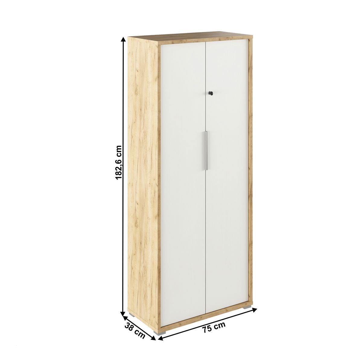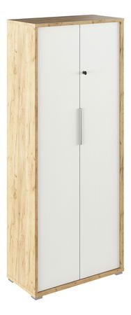 Kancelářská skříň Rumia 31 (dub artisan + bílá) je vysoká 182,6 cm, široká 75 cm a hluboká 38 cm. Tato skříň je ideální pro uspořádání a zorganizování vašich věcí v kanceláři. Skříň má uzamykatelné dveře a na levé straně naleznete věšákovou část pro vaše oblečení. Nad věšákovou tyčí se nachází police pro uložení dalších věcí. Na pravé straně se nachází policová část, která je rozdělena na čtyři části. Tato skříň je vyrobena z kvalitního DTD materiálu, který je laminován v kombinaci dub artisan a bílá barva. Kancelářská skříň Rumia 31 je praktická a elegantní volba pro každého, kdo potřebuje uspořádat svůj pracovní prostor.