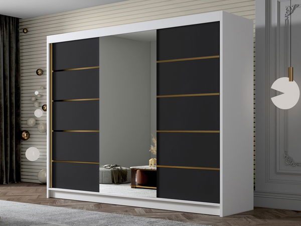 Šatní skříň s posuvnými dveřmi Gamarut VI 200 (bílá + černá + zlatá) (se zrcadlem)
