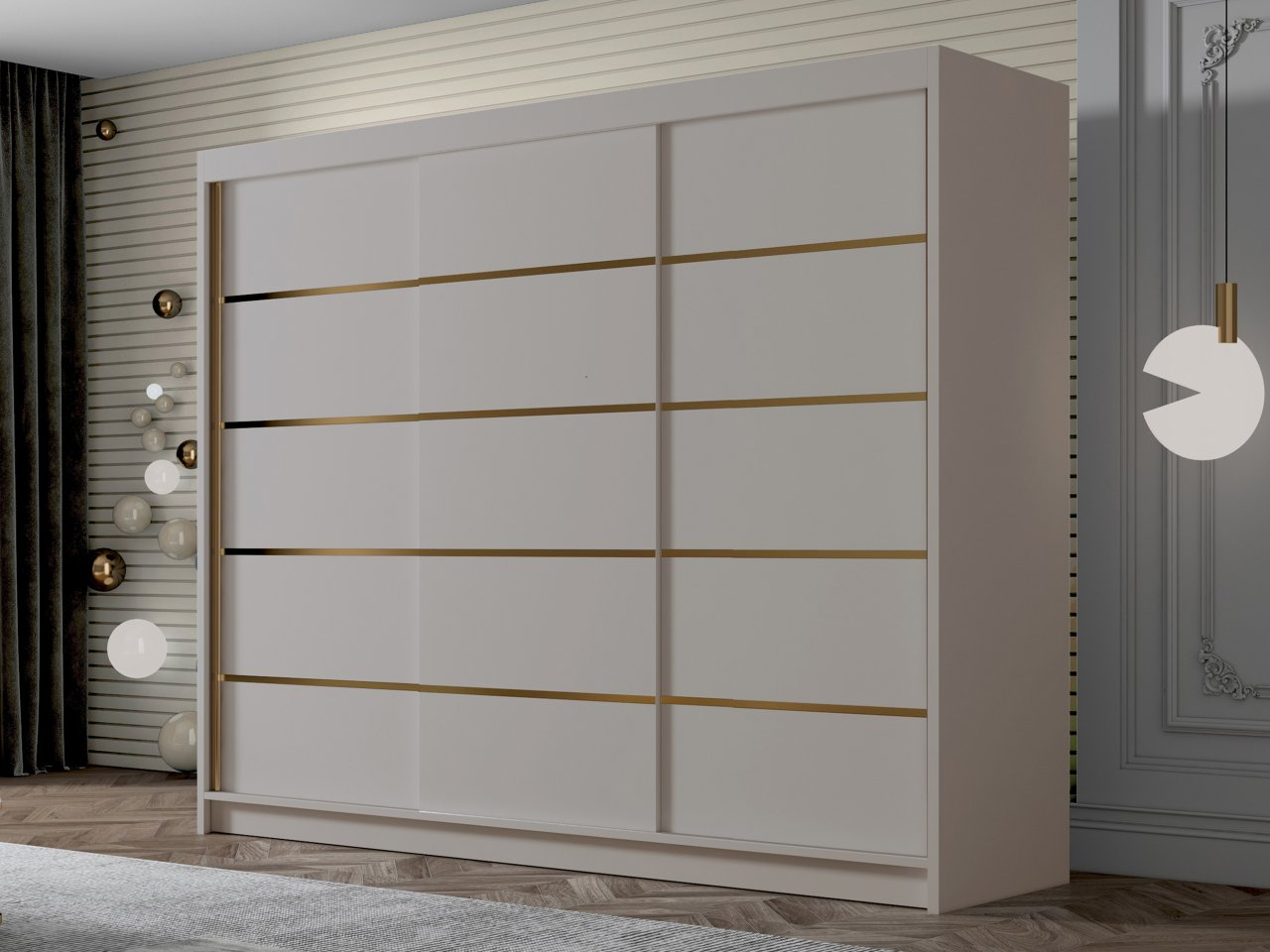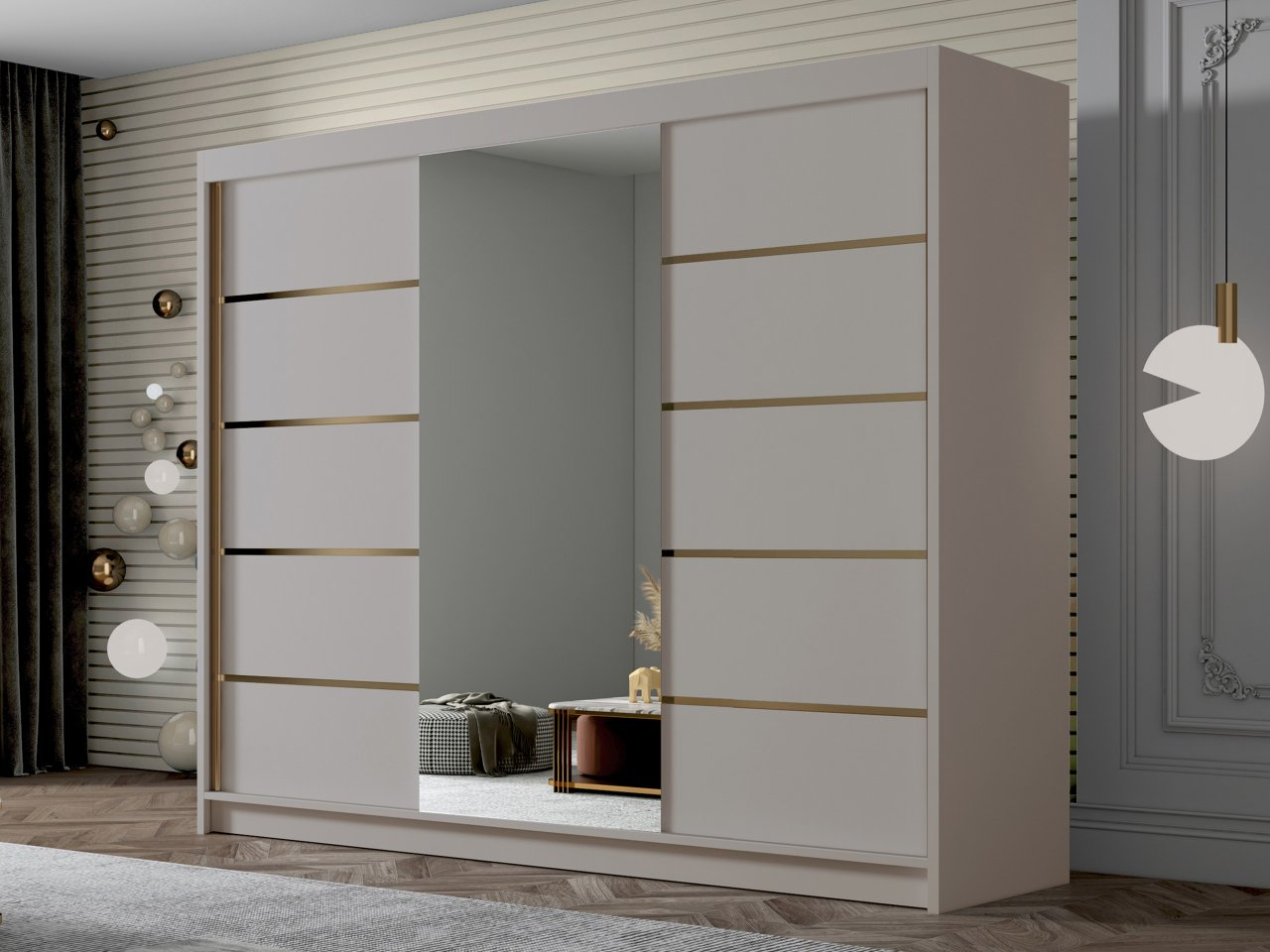 Hledáte velkou, prostornou a stylovou šatní skříň do ložnice? Gamarut VI 250 přichází na záchranu! S ní si můžete uspořádat oblečení, boty a další doplňky, například kabelky. Skříň nabízí řadu polic s velkou kapacitou. Snadno se v ní uloží předměty i pro dvě osoby. Uvnitř najdete také tyč na ramínka, která zvyšuje její funkčnost. Šaty a obleky můžete uložit bez obav ze záhybů. Jedinečný design šatní skříně Gamarut VI 250 se zrcadlem zapadne do různých ložnic. Ozdobné vložky v matném zlatě dodávají skříni eleganci a prestiž.