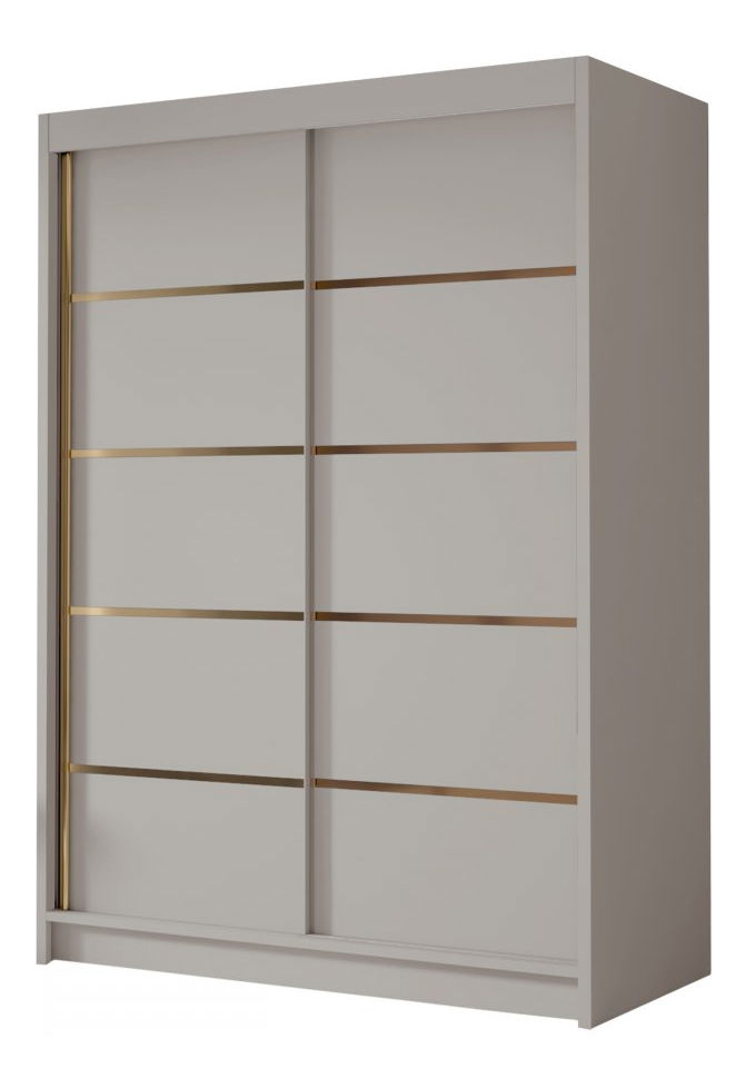 ZobrazitBezzrcadlová šatní skříň s posuvnými dveřmi Varentona IV 120 má řadu praktických funkcí, které zvyšují funkčnost prostoru, ve kterém je umístěna. Je to ideální kus nábytku pro uskladnění v ložnici a předsíni. Funkčnost skříně využijete také v obývacím pokoji. Šatní skříň za posuvnými dveřmi ukrývá několik prostorných polic a věšákovou tyč. Své místo zde najdou bundy, kabáty, košile, šaty, ale také boty či klobouky. Každý kus oblečení bude přehledně uspořádán a snadno dostupný. Za zmínku stojí také design šatníku. Čela jsou pokryta horizontálními lamelami ve zlaté barvě. Takový dekor vhodně doplní elegantní design interiéru.