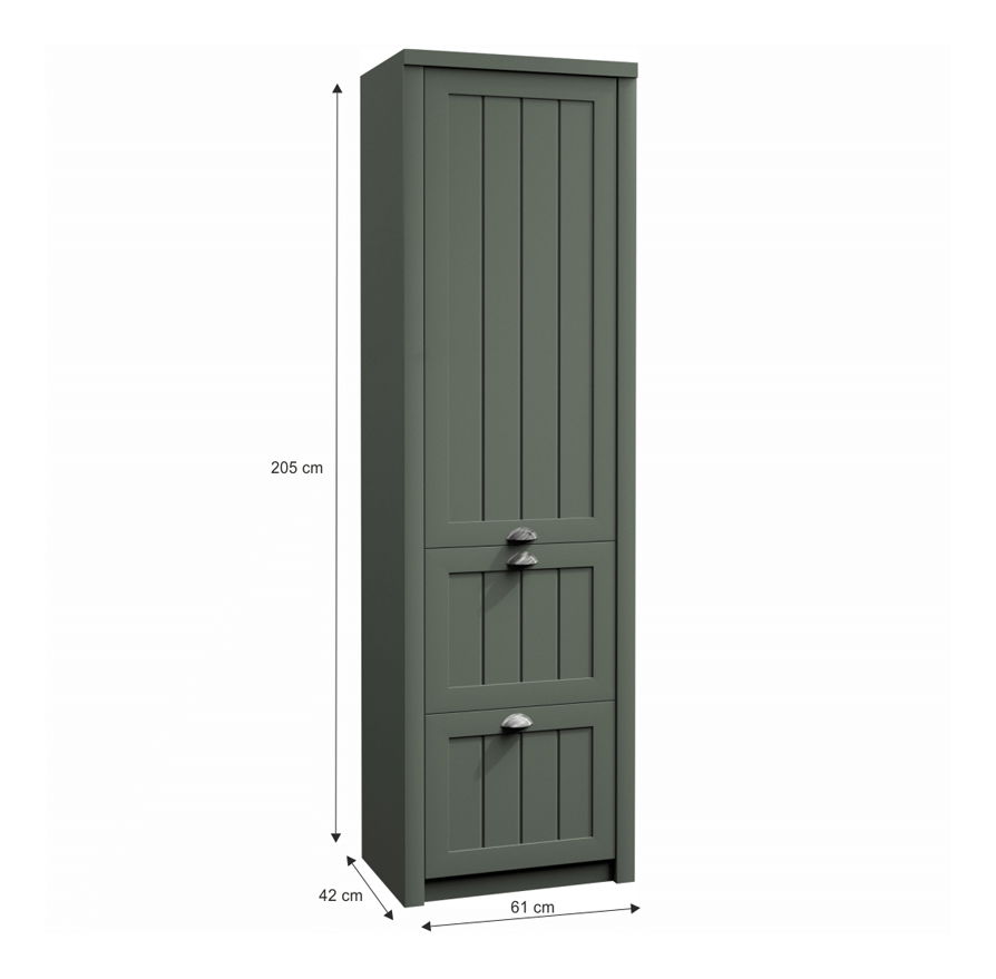Věšáková skříň S1D2S Provense v zelené barvě je kvalitní a praktický kus nábytku pro vaše šatstvo. S výškou 205 cm a hloubkou 42 cm se vejde i do menších prostor. Materiál skříně je DTD laminována o tloušťce korpusu 15 mm a vrchní desky 22 mm. Skříň disponuje dvojicí zásuvek a úchytkami na zavěšení. Skládá se z více dílů a dodává se v demontu, ale snadno a rychle ji dokážete sundat sami. Skříň je vhodná pro ty, kteří hledají praktické řešení pro své šatstvo bez obětování kvality a designu.