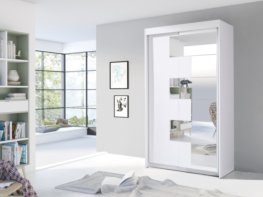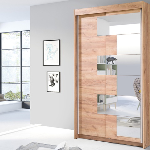 Šatní skříň Salcombe uspokojí i náročnější uživatele. Na posuvných dveřích se nacházejí zrcadlové panely. Vnitřní uspořádání je velmi praktické. V levé části se nachází věšáková tyč a v pravé části 4 police.