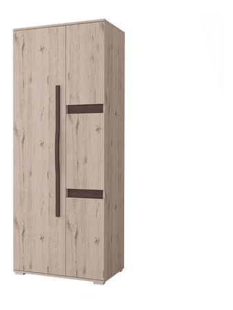 Šatní skříň - Sanwilf (dub craft šedý + dub sonoma čokoláda) o výšce 202 cm, šířce 80 cm a hloubce 52 cm je praktickým kusem nábytku. Je vyrobena z 16 mm silné dřevotřísky s vnějším i vnitřním materiálem a má 0,5 mm ABS hrany. Skříň je vybavena PVC úchyty, plastovými nožičkami, dvěma dveřmi, jednou tyčí na zavěšení oblečení a jednou poličkou. Přestože skříň neobsahuje zrcadlo, je ideální pro úložný prostor pro vaši oděvní kolekci.