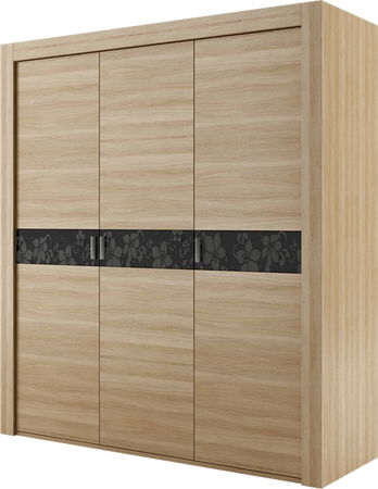 Tvojdverová šatní skříň s křídlovými dveřmi s tmavým designovým pásem ze skla v květinovém motivu uprostřed vodorovně. Skříň má věšákovou tyč nalevo, pod ní je dvojpolička a 5 velkých poliček je za dveřmi na pravé straně, kde uložíte své oblečení.
