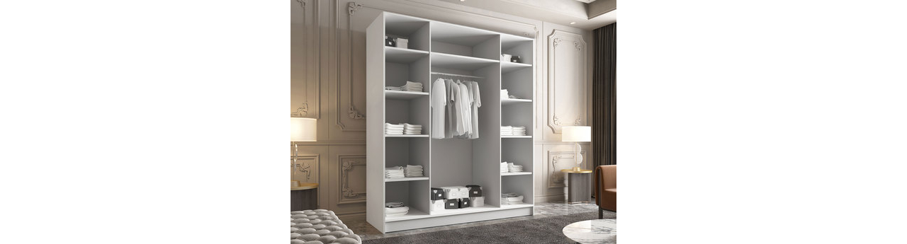 Prostorná šatní skříň Sezalos I je skvělým základem pro uložení oblečení, doplňků a tašek. Prostorný interiér nábytku nabízí množství polic ak dispozici je i samostatný prostor pro zavěšení ramínek. Dobře organizovaná čtyřdveřová šatní skříň Sezalos I usnadňuje rozkládání oblečení a podporuje i ochranu oblečení před nadměrným pokrčením. Módní vzhled šatní skříně podtrhují dlouhé okrajové úchyty. Jejich minimalismus dokonale doplňuje jednoduchý tvar – podtrhuje skromnou eleganci celého nábytku. V takovém elegantním vzhledu vypadá šatní skříň skvěle i v pokoji pro hosty.