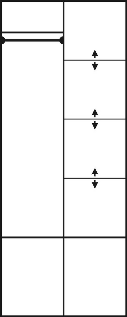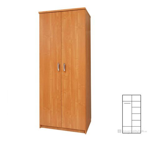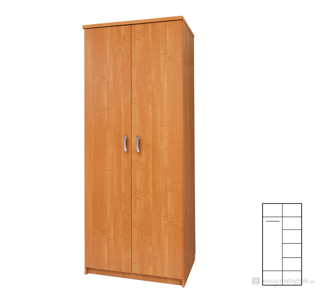ZobrazitModerní dvoudílná šatní skříň s dostatkem úložného prostoru. Uvnitř se v levé části nachází pod poličkou věšáková tyč. Na spodku obou dílů se nacházejí poličky ve stejné výšce. Pravý díl skříně je policový a má tedy další 3 police. Provedení: olše nebo buk