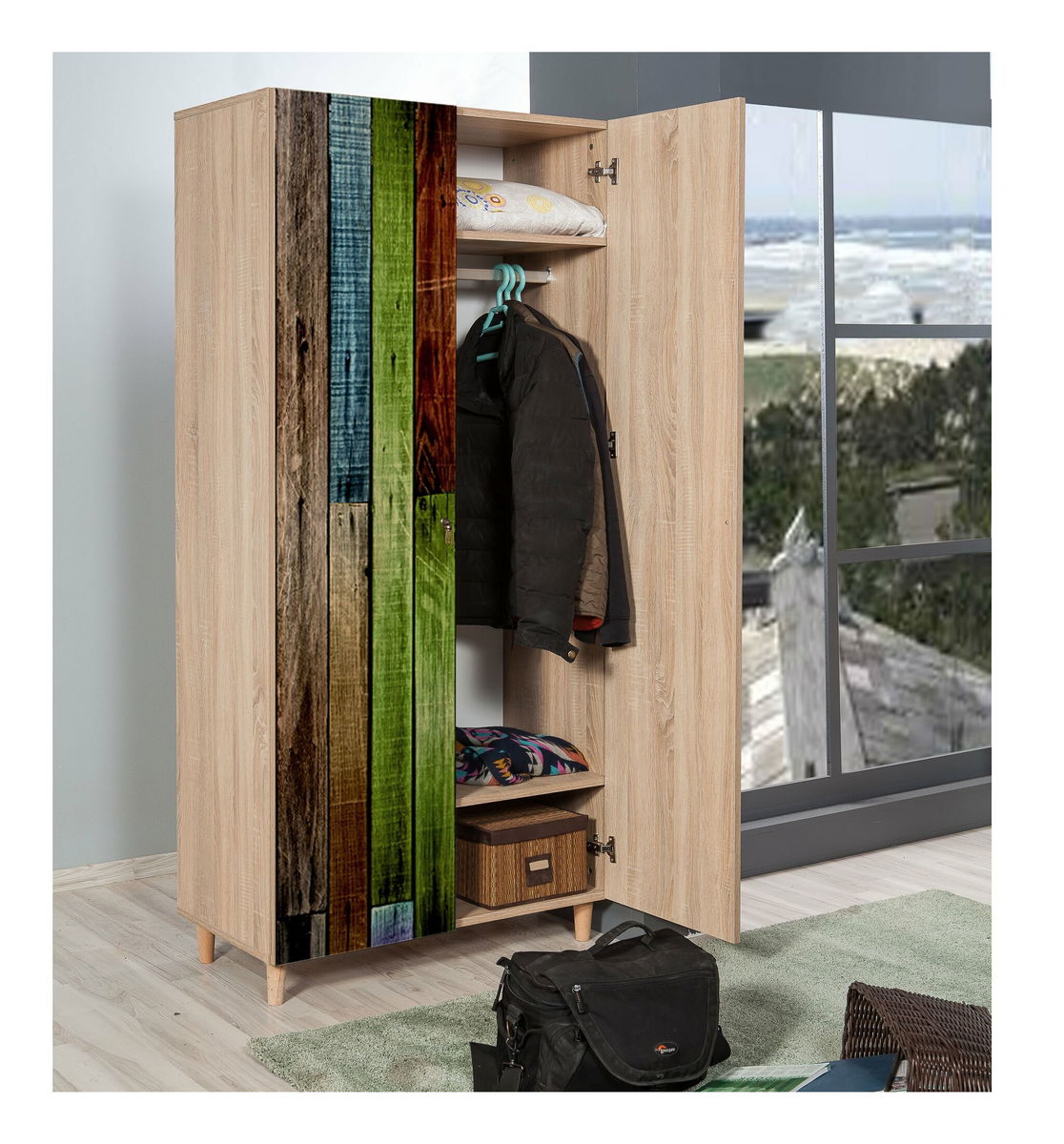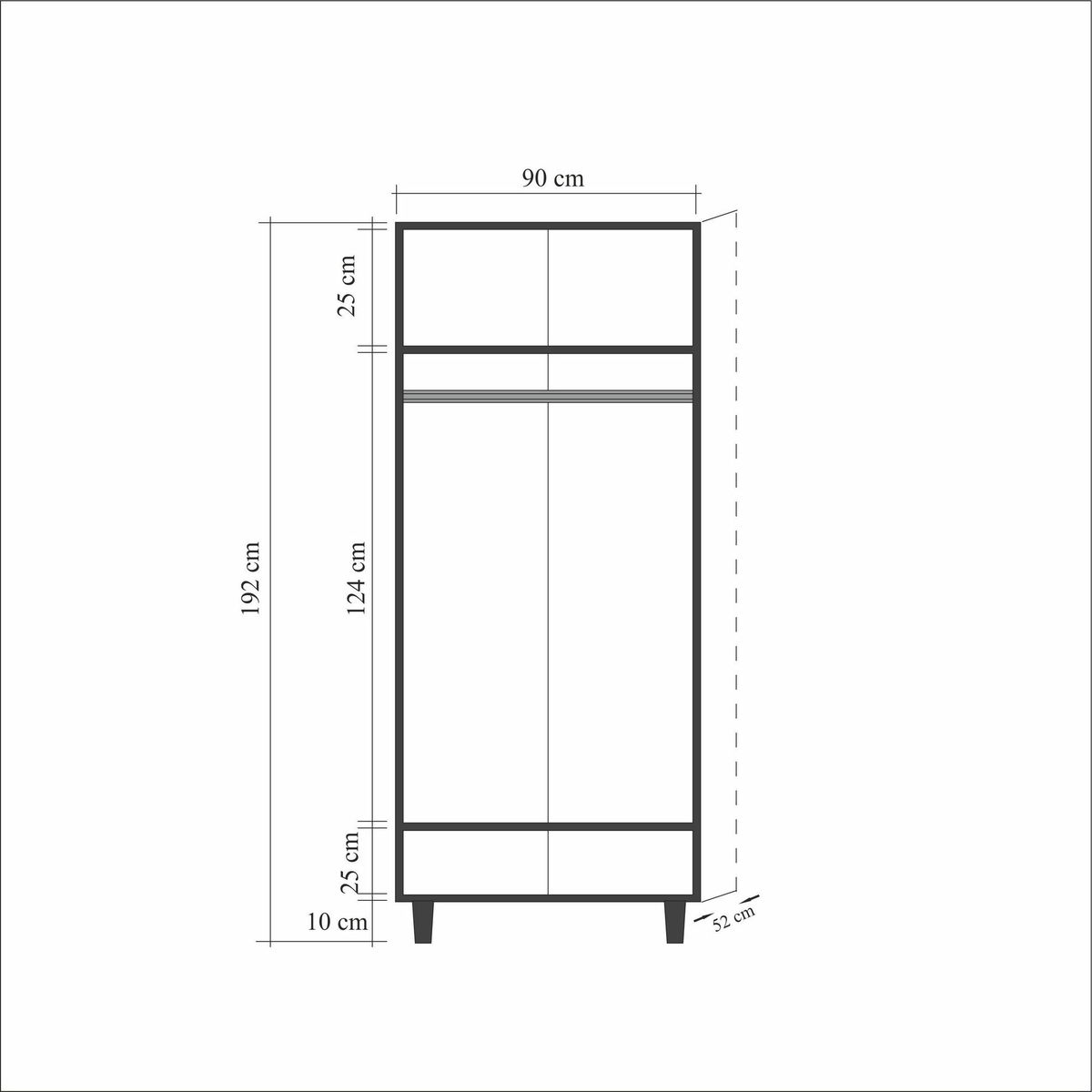 tloušťka: 18 mm, habrové nohy, kovové rukojeti, uv nátěr, šířka: 90 cm, výška: 192 cm, hloubka: 52 cm, výška horní police: 25 cm, výška spodní police: 25 cm, výška nohy: 10 cm