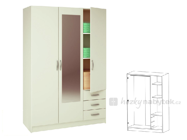 Třídveřová šatní skříň, která najde uplatnění jak v ložnici či pracovně, tak i v předsíni. V pravé dolní části má tři zásuvky, nad kterými je policová část skříně. Ostatní prostor je určen k zavěšení Vašeho oblečení. Je vyrobena z foliované DTD bílé barvy. Na středních dveřích je umístěno zrcadlo.
