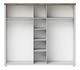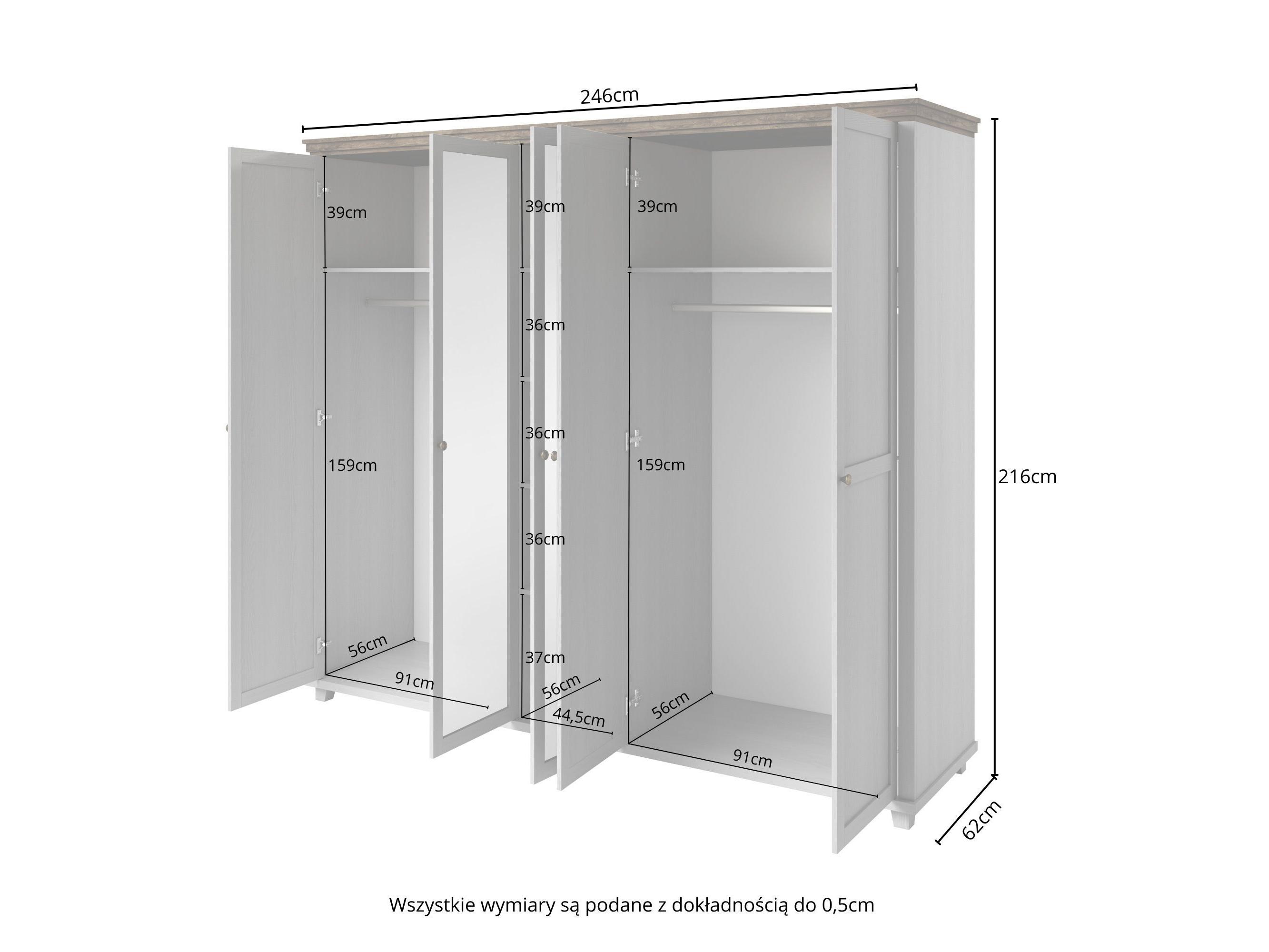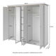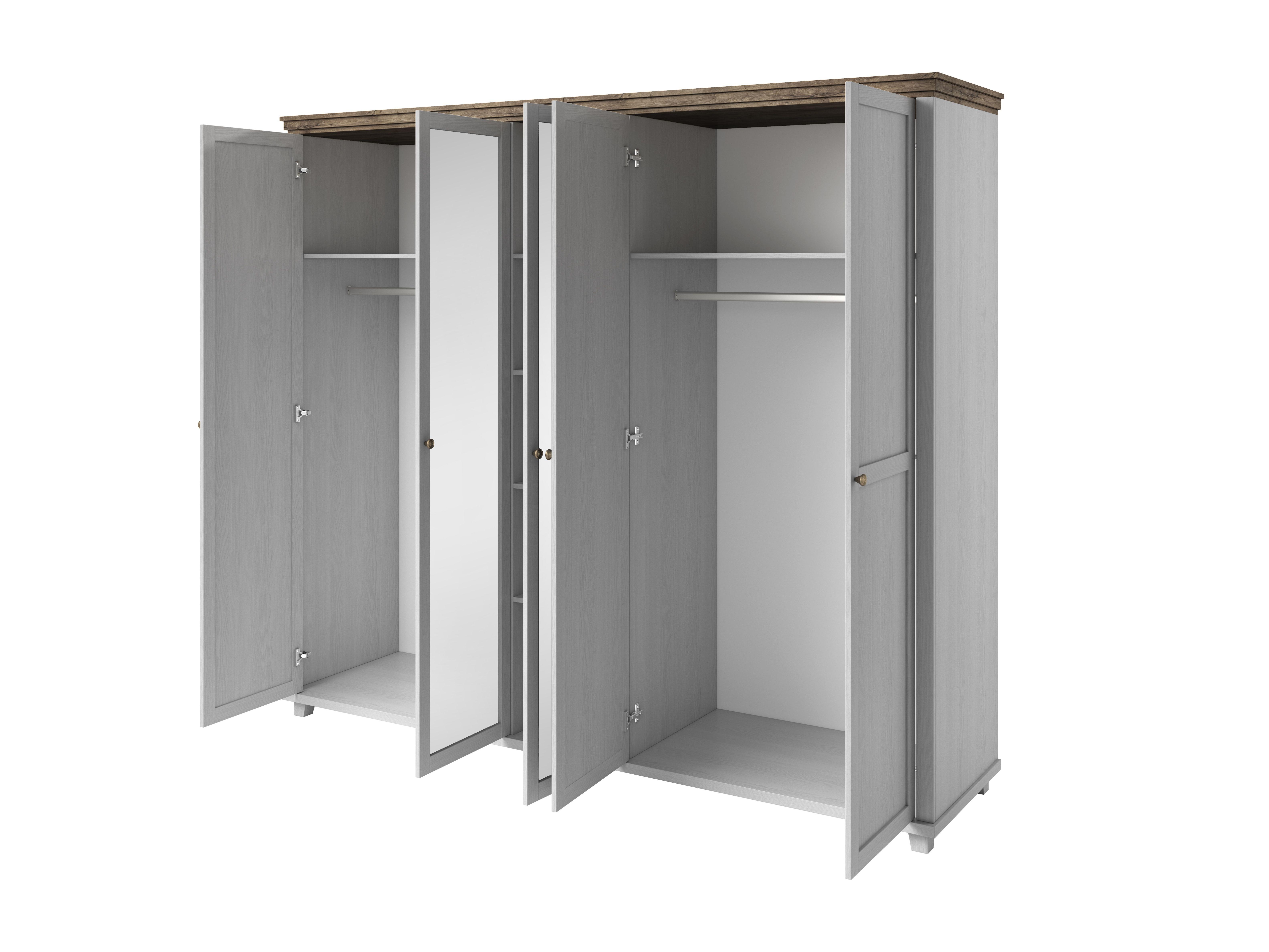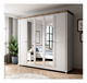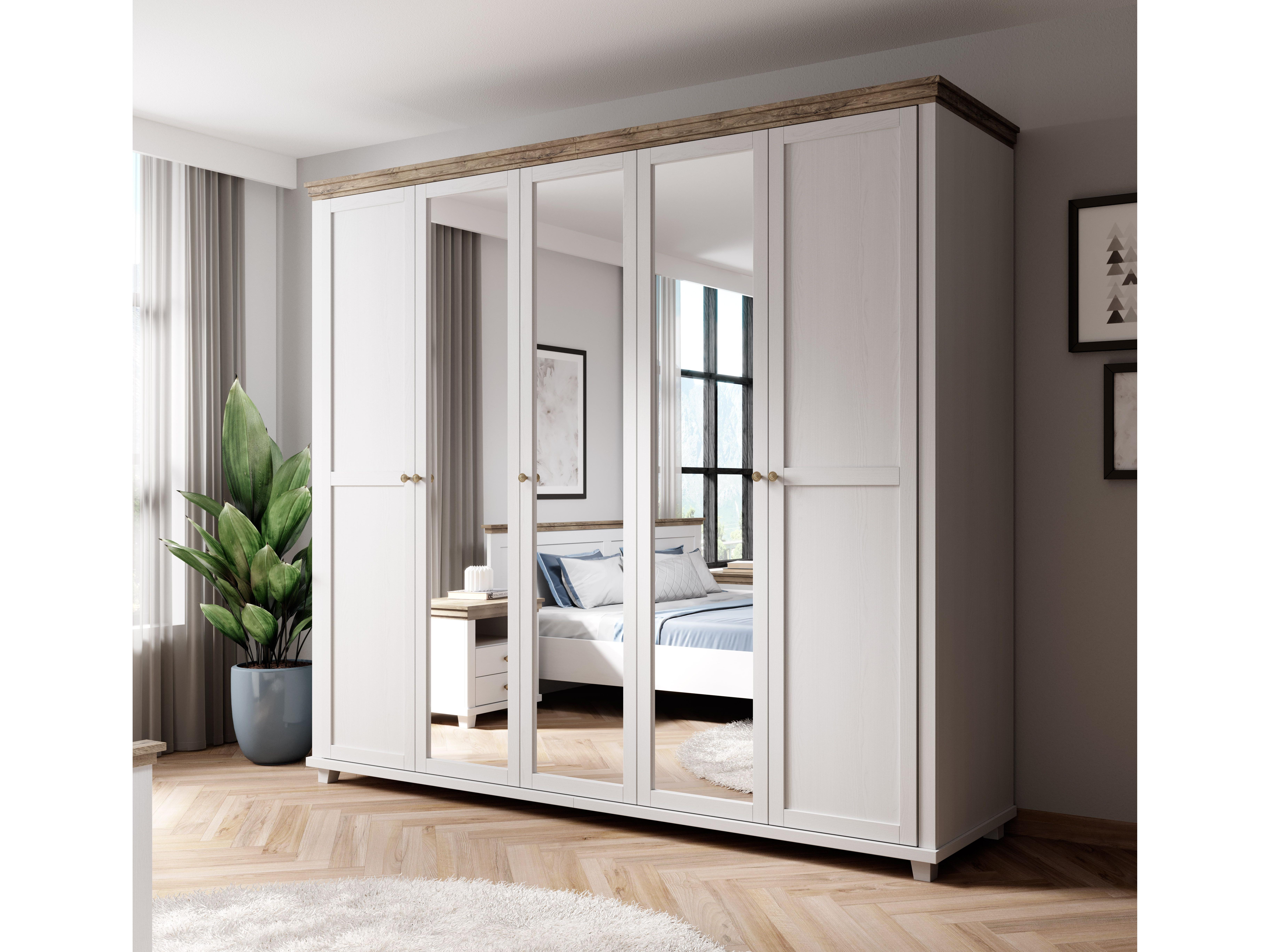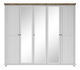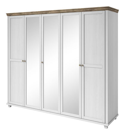 Prostorná až pětidveřová šatní skříň ze série Elvina ve spojení rustikální vznešenost a skandinávského minimalismu. Na středních třech dvířkách se nacházejí zrcadla, která opticky zvětší prostor. Dopřejte svému oblečení volnost a pořádek. Ve střední části jsou prakticky umístěny police, přičemž na pravé a levé straně jsou věšákové tyče, nad kterými se také nachází jedna police. Vhodná je do ložnice i chodby.