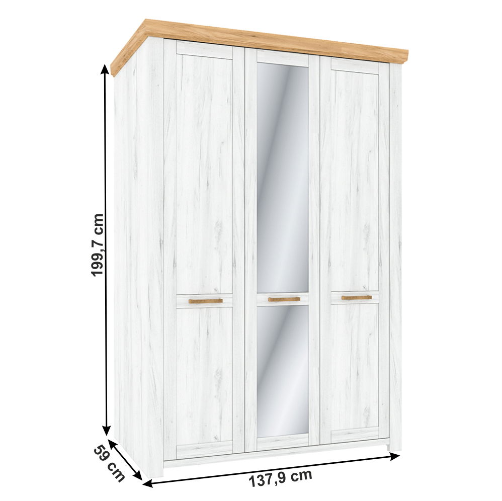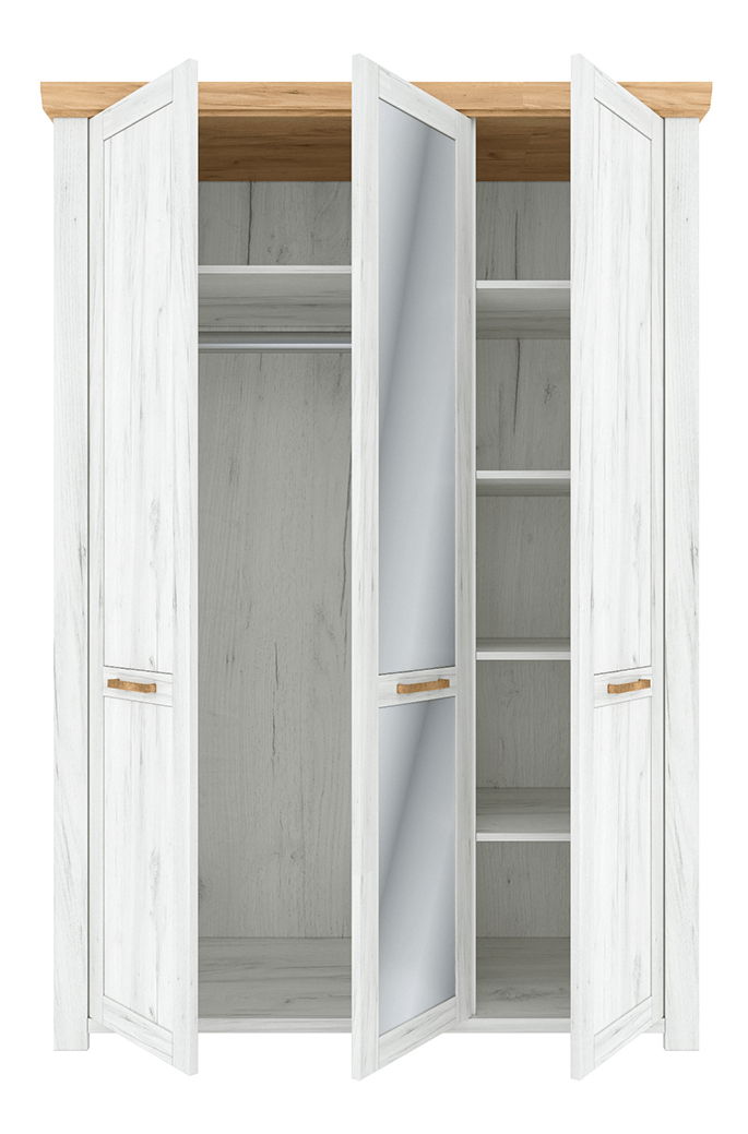 Šatní skříň Soleus H o výšce 199,7 cm a hloubce 59 cm v dub craft zlaté a bílém barvě je ideálním doplňkem do vašeho interiéru. Vyrobena je z kvalitního materiálu DTD laminovaná/MDF o tloušťce materiálu korpusu 16 mm, tloušťce materiálu vrchní desky 22 mm a tloušťce materiálu dveří 19 mm. S výškou spodního prostoru od podlahy 4,2 cm, je tato skříň vybavena úložnými prostory, které vám umožní uspořádat vaši šatní zónu podle vašich představ. Tato třídveřová skříň má věšákovou tyč, police a zrcadlo. Skříň je dodávána v demontu, ale s jasnými pokyny pro snadnou montáž. S Šatní skříní Soleus H získáte praktický a stylový prvek do vaší domácnosti.