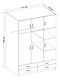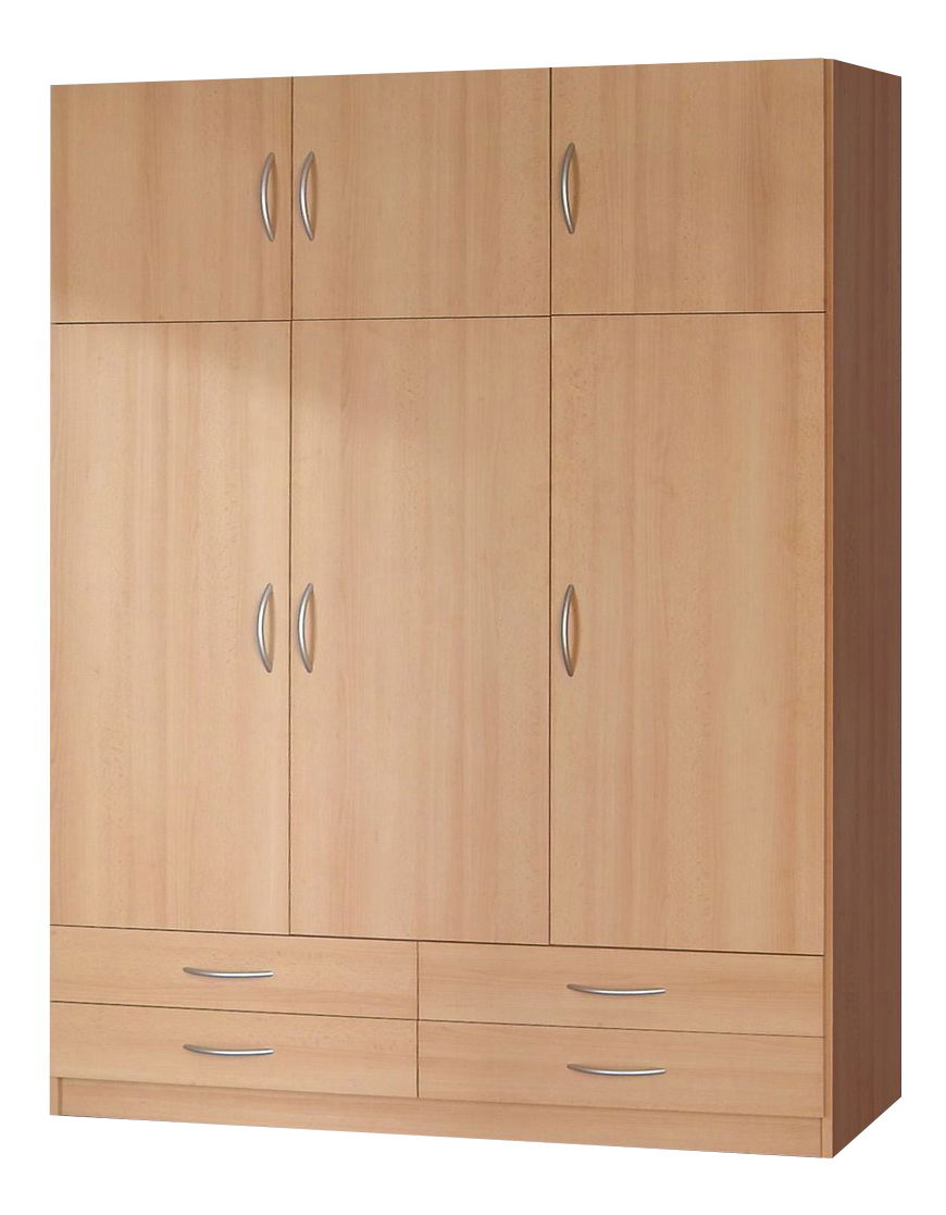 ZobrazitPokud chcete mít pořádek v oblečení, tato prostorná skříň je určena právě Vám. Ve spodní části se nacházejí čtyři zásuvky. Nad nimi je v pravé části skříňka s dvěma poličkami a jedněmi dvířky. Na levo od ní je jedna dlouhá věšáková tyč. Na vrchu skříně se nachází ještě nástavba se třemi dvířky. Jednoduchý design a moderní barva dřeva buk zaručí, že se skříň hodí do každé ložnice, šatníku či předsíně.