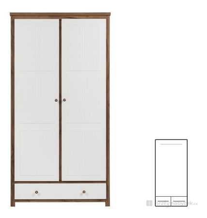 Stylová dvoudílná šatní skříň s vysokými dveřmi na šatní části a nízkými dvířky na spodku skříně. Zajímavé drobné kulaté úchyty na dvířkách v provedení dub příjemně osvěží světlé provedení.