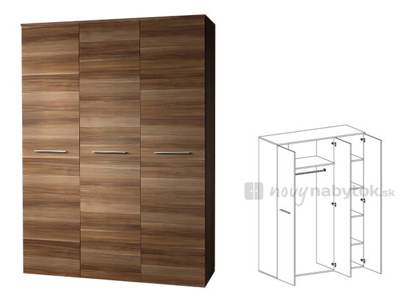 Moderní šatní skříň je praktický doplněk k ostatnímu nábytku ve Vaší obývacím pokoji, předsíni, ložnici, pracovně či kanceláři. Skříň je třídveřová, přičemž v levé části se nachází věšáková tyč, která je umístěna pod poličkou. V pravé části jsou čtyři poličky. Je vyráběna ve více barevných kombinacích a tak si určitě najdete tu vhodnou skříň, která dokonale zapadne k Vašemu ostatnímu nábytku.