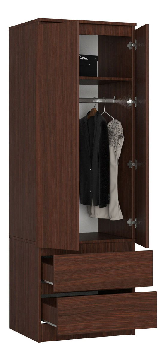ZobrazitŠatní skříň Suman je vyrobena ze 16 mm laminované desky odolné vůči oděru. Okraje jsou pokryty ABS hranami. Čela zásuvek jsou také vyrobena z laminované desky. Uvnitř dvířek je police a tyč na šaty. Zásuvky se posouvají na kovových válečkových vedeních. Dostupná iv jiných barevných provedeních.