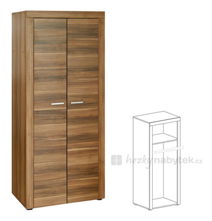 Dvoudveřová šatní skříň nabízí v horní části poličku, pod kterou je umístěna věšáková tyč. Je vyrobena z laminované DTD v barevném provedení dřeva švestka. Je vhodná jako doplněk k obývací stěně Tako.