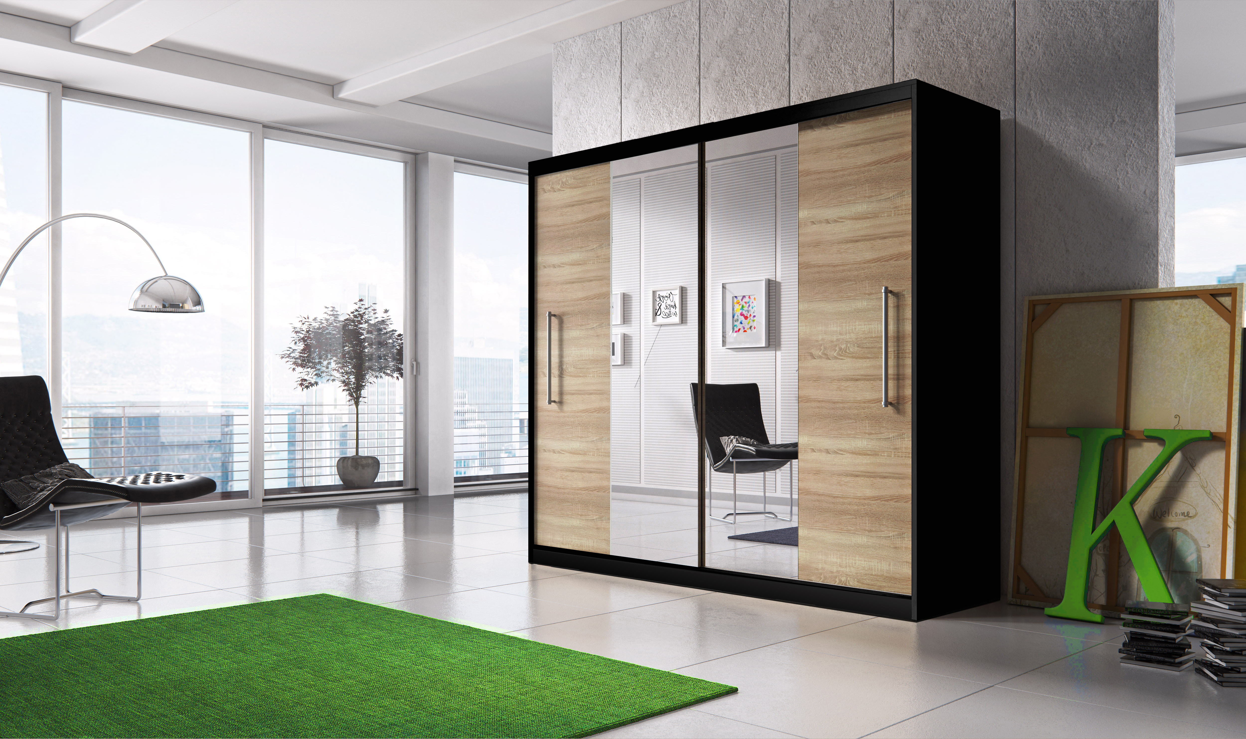 Šatní skříň Thovan (černá + dub sonoma + zrcadlo)