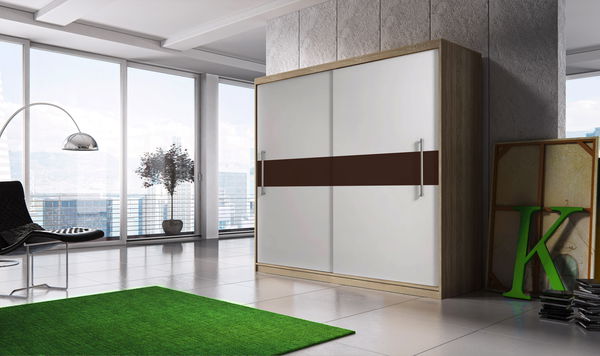 - Šatní skříň Thovan (dub sonoma + bílá + hnědý pás)