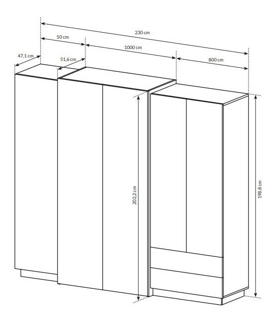ZobrazitŠatní skříň - Three 230 je stylový a praktický kousek nábytku, který Vám pomůže udržet Vaše oblečení a doplňky organizované a uspořádané. S výškou 201.8 cm, šířkou 230 cm a hloubkou 51.6 cm poskytuje dostatek prostoru pro vaši kolekci oblečení. Skříň je vyrobena z kvalitního dubového dřeva a kombinuje luxusní zlatý a čistý bílý design. S více oddělenými oddíly a police přizpůsobitelnými vašim potřebám, tato skříň je ideálním doplňkem pro každou ložnici nebo šatník. Uchovává vše na jednom místě a dodává elegantní dotek do vašeho interiéru.
