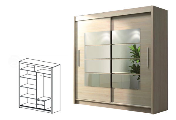 Šatní skříň Toronto působí velmi moderně a zkrášlí prostor Vaší ložnice. Má dvoje posuvné dveře, na kterých jsou umístěny zrcadla a plastové podlouhlé úchyty. Je vyrobena z kvalitní LTD v barvě dřeva dub sonoma. Vnitřní uspořádání skříně můžete vidět na náčrtu. Hrany jsou ukončeny ABS úpravou, která zvyšuje odolnost vůči mechanickému poškození, udržuje barevnou stálost a odolnost proti vlhkosti.