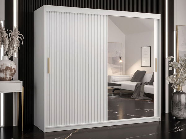 Šatní skříň se zrcadlem je ideální volbou pro ty, kteří hledají pohodlí a styl. Hledáte praktická a elegantní řešení, která vám umožní pohodlně uložit oblečení, ale zároveň vnese do vašeho interiéru moderní a stylový nádech? To je skvělé, protože vám představujeme šatní skříň Towiro Slim 2 200 se zrcadlem! Posuvná šatní skříň je vyrobena z vysoce kvalitních materiálů a zaujme nejen svým minimalistickým designem, ale také detaily, které podtrhují její jedinečný charakter. Rýhovaná čela dodávají šatníku jemnost, zatímco zlaté úchyty vytvářejí harmonický celek a poskytují znamenitý dekorativní prvek. Jednou z nejdůležitějších předností šatní skříně do ložnice je její funkčnost. Vnitřní prostor nábytku byl navržen tak, aby poskytoval maximální úložný prostor pro oblečení a doplňky. Kromě toho byla šatní skříň vybavena praktickým zrcadlem, které vám usnadní každodenní přípravy na odchod z domu. Rozměry: šířka: 200 cm, výška: 200 cm, hloubka: 62 cm Provedení: korpus: 16 mm silná laminovaná deska, čela: 18 mm MDF deska s viditelným frézováním, hrany upravené trvanlivou PVC dýhou odolnou vůči poškození, posuvné dveře na hliníkových zlaté barvy, leštěné zrcadlo na přední straně, interiér s policemi a věšáky na oblečení. Záruka: 24 měsíců