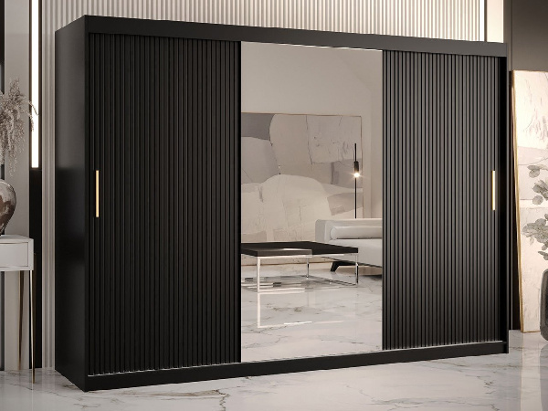 Velká skříň je ideální volbou pro ty, kteří hledají pohodlí a styl. Prostorný vnitřní prostor posuvné skříně Towiro Slim 2 250 cm pořádá úložný prostor v rodinném šatníku. Teplé svetry, trička a topy najdou své místo na mnoha policích. Poskytuje také vynikající prostor pro kabelky, klobouky a kufry. Na tyčích na oblečení zase můžete zavěsit elegantní halenky, košile a šaty. Tento prostor poslouží také na obleky, saka a podzimní trenčkoty. Šatní skříň Towiro Slim 2 250 se zrcadlem se vyznačuje také zajímavým designem. Její čela zdobí charakteristické drážky. Jedná se o módní strukturu, která podtrhuje elegantní vzhled nábytku, který navíc dodává zařízení celé místnosti nádech avantgardy. Rozměry: šířka: 250 cm, výška: 200 cm hloubka: 62 cm Design: korpus: 16 mm silná laminovaná deska, čela: 18 mm MDF deska s viditelným frézováním, hrany jsou zakončeny odolnou PVC dýhou odolnou vůči poškození, posuvné dveře rukojeti zlaté barvy, leštěné zrcadlo na přední straně, interiér s policemi a věšáky na oblečení Záruka: 24 měsíců