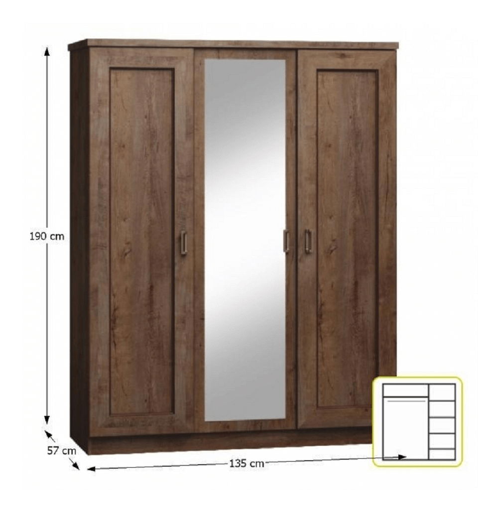 Šatní skříň Tureis Typ T15 o výšce 190 cm a hloubce 57 cm je ideální volbou pro ty, kteří hledají prostorné řešení pro uložení svého oblečení. Skříň disponuje dostatečným úložným prostorem a zrcadlem uprostřed, což ji činí praktickou i pro každodenní oblékání. Její rustikální styl a pěkné provedení v dub lefkas vyniknou v každém pokoji a dodají jí příjemnou atmosféru. Nábytek Tureis je vhodný pro ty, kdo upřednostňují tradiční rustikální styl a hledají kvalitní a masivní nábytek. Díky větším kovovým úchytům na dvířkách a zásuvkách a masivnějšímu vzhledu, je tento sektorový nábytek velmi vhodný pro zařízení jídelny, obývacího pokoje, pracovny nebo i ložnice. Skříň Tureis je dodávána v pěkném provedení dub lefkas a jistě bude skvělým doplňkem pro Vaši domácnost.