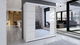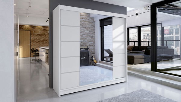 Potřebujete velkou šatní skříň, která bude nabízet police a tyč pro ramínka? Šířka šatníku je 180 cm a výška 215 cm. Příčky a police jsou vyrobeny ze stejné desky jako tělo, díky čemuž jsou odolné a stabilní. Posuvné dveře pracují lehce a jejich otevírání usnadňuje rukojeť ve formě hliníkového pruhu, který vede podél dveří. Rukojeti dodávají šatníku moderní vzhled a zabraňují jejímu ohnutí. Přední část skříně je kombinací velkého zrcadla, matné povrchové úpravy a ozdobných lamel. Kromě toho může být šatník osvětlen LED diodami.