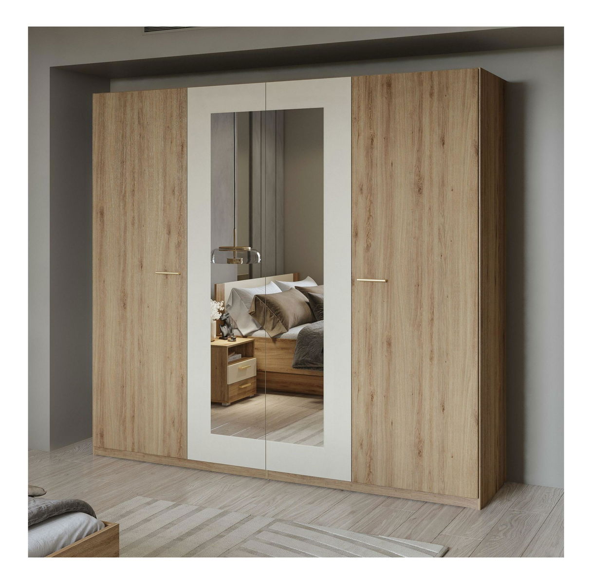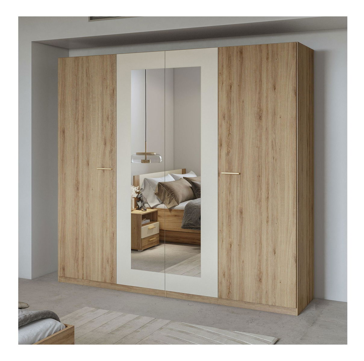 Šatní skříň - Verdeene L (divoký dub + béžová) - Funkční a minimalistický kousek pro váš domov! S rozměry 215 x 228 x 59 cm vám poskytne dostatek úložného prostoru a zrcadlo přímo na dveřích šetří místo, které můžete využít efektivněji.