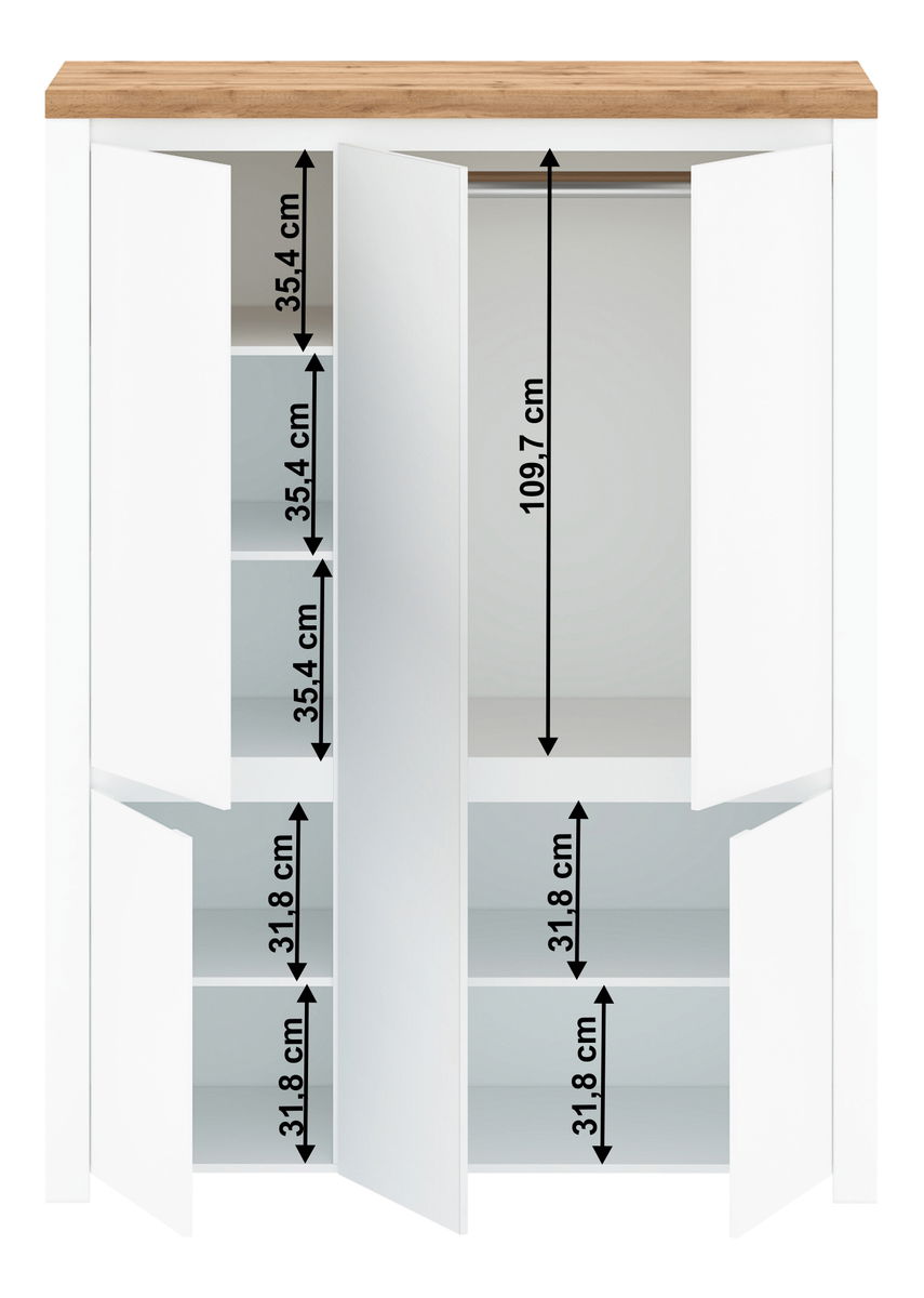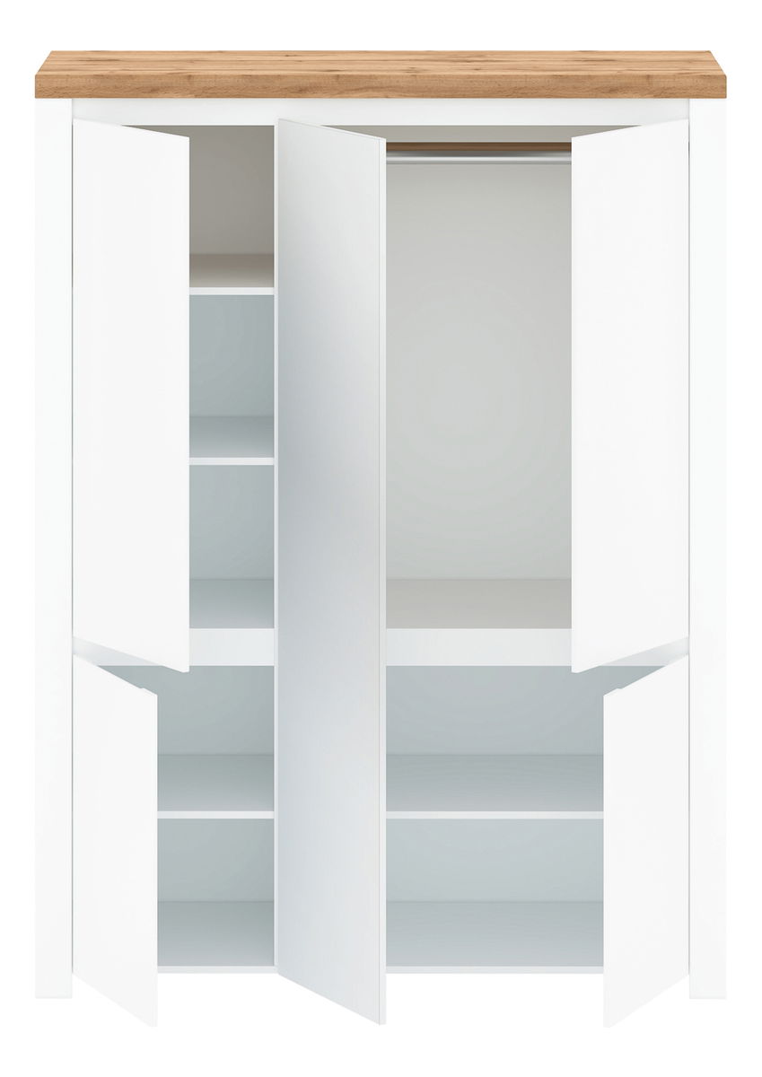 Skříň Vilgi 5D se zrcadlem v lesku bílým a dubu wotan je ideálním kouskem pro ty, kteří hledají luxusní a elegantní nábytek pro svůj pokoj. vašich věcí. Vyrobila se z kvalitních materiálů, laminované dřevotřísky v kombinaci bílá HG a dub wotan, což zaručuje trvanlivost a odolnost. Skříň je uvnitř rozdělena na čtyři části, z nichž jedna je vyhrazena pro ramínka a ostatní tři jsou policové, takže uspořádání vašich věcí nikdy nebylo tak jednoduché. rozjasní váš pokoj a dodá jí pocit čistoty a pořádku.