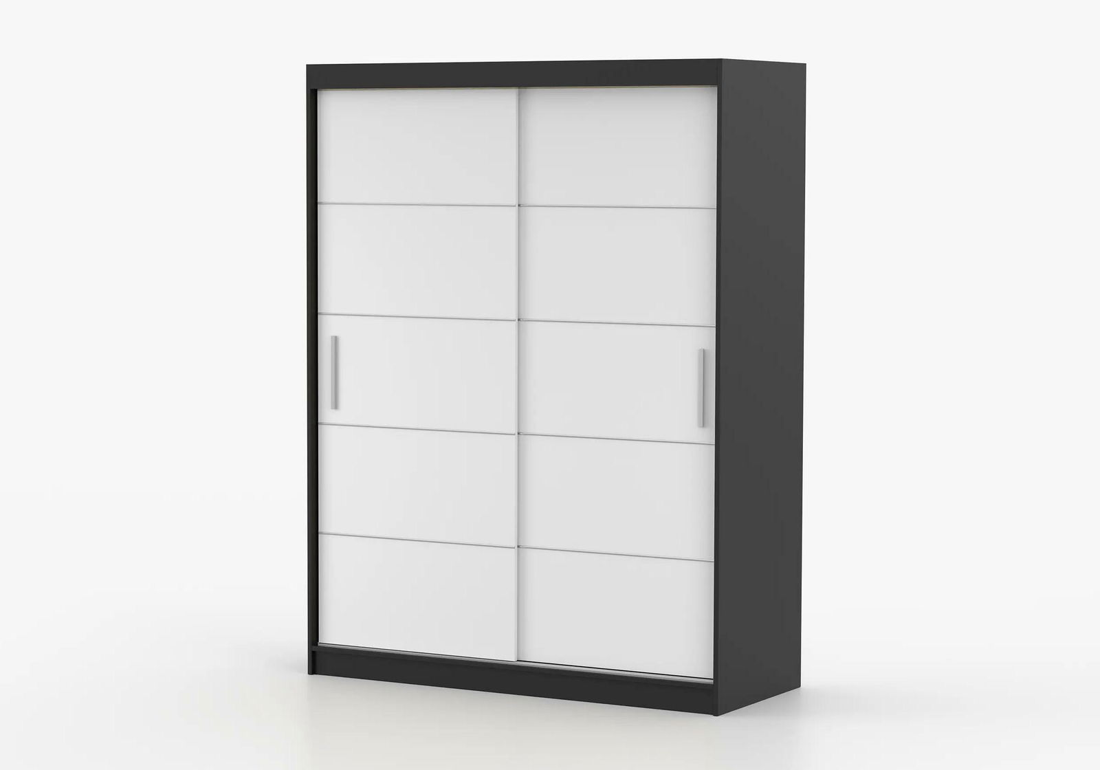 Šatní skříň, vhodná pro moderní domovy, je vyrobena z 16 mm silné dřevotřísky, která je použita jak na vnější, tak na vnitřní stranu. Okraje skříně jsou ošetřeny 0,5 mm silnými ABS hranami pro zvýšenou odolnost a kvalitní vzhled. Skříň obsahuje úchyty z PVC ve svislém tvaru, které jsou stříbrné barvy a přidávají skříni moderní nádech. Úchyty jsou pevně připevněny šroubovým způsobem. Skříň není vybavena zrcadlem, což zvyšuje její univerzálnost v různých typech místností. Uvnitř skříně se nachází jedna podélná tyč na pravé straně, vhodná pro zavěšení oděvů. Celkově skříň nabízí pět poliček, z nichž čtyři jsou umístěny na levé straně a jedna na pravé. Toto rozložení poliček umožňuje efektivní uspořádání a organizaci oděvů a jiných předmětů. Tato šatní skříň je praktickým a esteticky přitažlivým kusem nábytku, který se hodí do každého moderního bytu či domu.