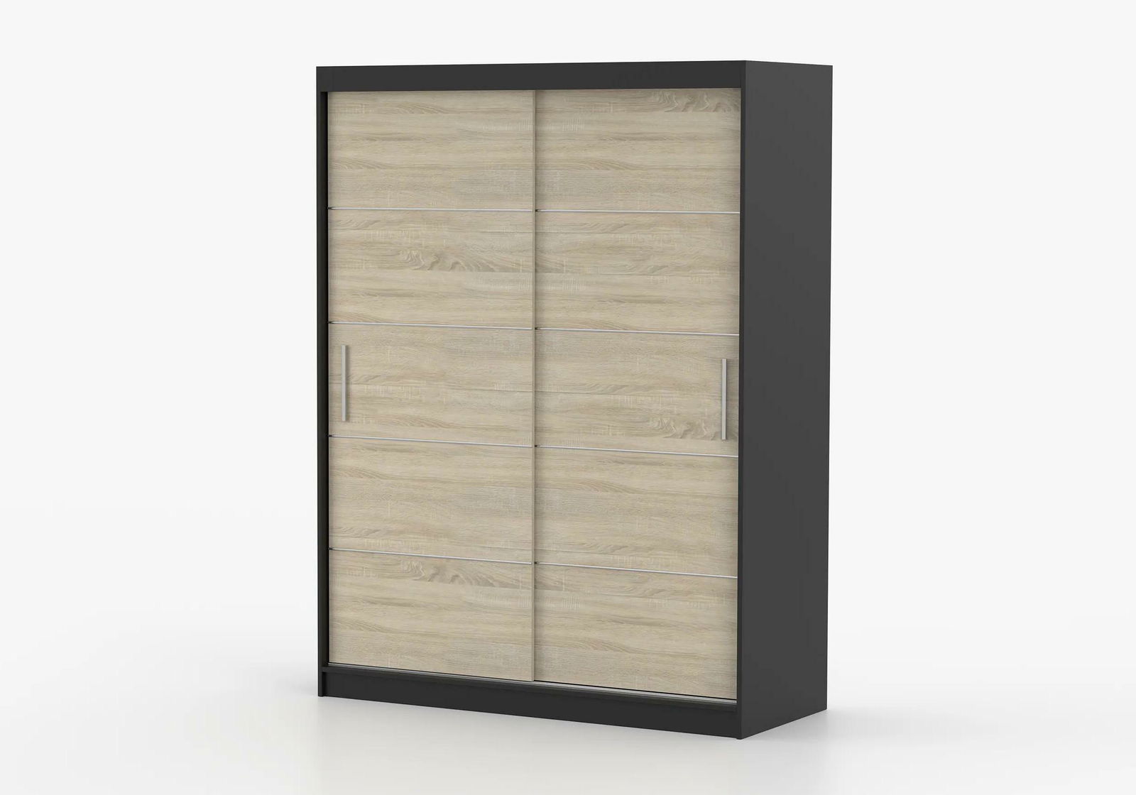 Šatní skříň, vhodná pro moderní domovy, je vyrobena z 16 mm silné dřevotřísky, která je použita jak na vnější, tak na vnitřní stranu. Okraje skříně jsou ošetřeny 0,5 mm silnými ABS hranami pro zvýšenou odolnost a kvalitní vzhled. Skříň obsahuje úchyty z PVC ve svislém tvaru, které jsou stříbrné barvy a přidávají skříni moderní nádech. Úchyty jsou pevně připevněny šroubovým způsobem. Skříň není vybavena zrcadlem, což zvyšuje její univerzálnost v různých typech místností. Uvnitř skříně se nachází jedna podélná tyč na pravé straně, vhodná pro zavěšení oděvů. Celkově skříň nabízí pět poliček, z nichž čtyři jsou umístěny na levé straně a jedna na pravé. Toto rozložení poliček umožňuje efektivní uspořádání a organizaci oděvů a jiných předmětů. Tato šatní skříň je praktickým a esteticky přitažlivým kusem nábytku, který se hodí do každého moderního bytu či domu.
