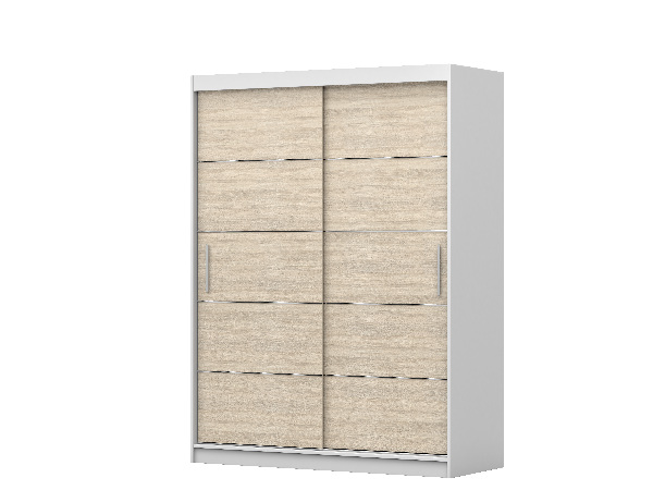 Šatní skříň, vhodná pro moderní domovy, je vyrobena z 16 mm silné dřevotřísky, která je použita jak na vnější, tak na vnitřní stranu. Okraje skříně jsou ošetřeny 0,5 mm silnými ABS hranami pro zvýšenou odolnost a kvalitní vzhled. Skříň obsahuje úchyty z PVC ve svislém tvaru, které jsou stříbrné barvy a přidávají skříni moderní nádech. Úchyty jsou pevně připevněny šroubovým způsobem. Skříň není vybavena zrcadlem, což zvyšuje její univerzálnost v různých typech místností. Uvnitř skříně se nachází jedna podélná tyč na pravé straně, vhodná pro zavěšení oděvů. Celkově skříň nabízí pět poliček, z nichž čtyři jsou umístěny na levé straně a jedna na pravé. Toto rozložení poliček umožňuje efektivní uspořádání a organizaci oděvů a jiných předmětů. Tato šatní skříň je praktickým a esteticky přitažlivým kusem nábytku, který se hodí do každého moderního bytu či domu.
