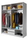 Šatní skříň, která má dvě oddělené tyče na věšení oblečení a v dolní části dvě poličky a jednu zásuvku. Led rám si umíte doobjednat za příplatek.