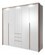 Prostorná šatní skříň, která se sklada z více částí. Po stranách ma věšákovou tyč a uprostřed skříně se nacházejí čtyři police a tři zásuvky. K šatní skříni si víte doobjednat LED rám.