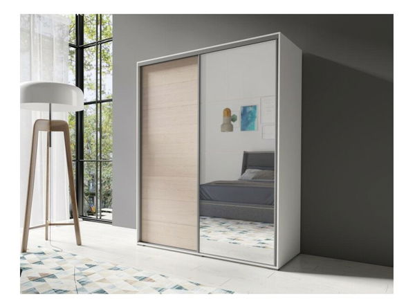 Šatní skříň Zack působí moderně a zkrášlí prostor Vaší ložnice. Na dveřích skříně je velký zrcadlový panel. V levé a střední části se nacházejí 2 věšákové tyče a v pravé části police.