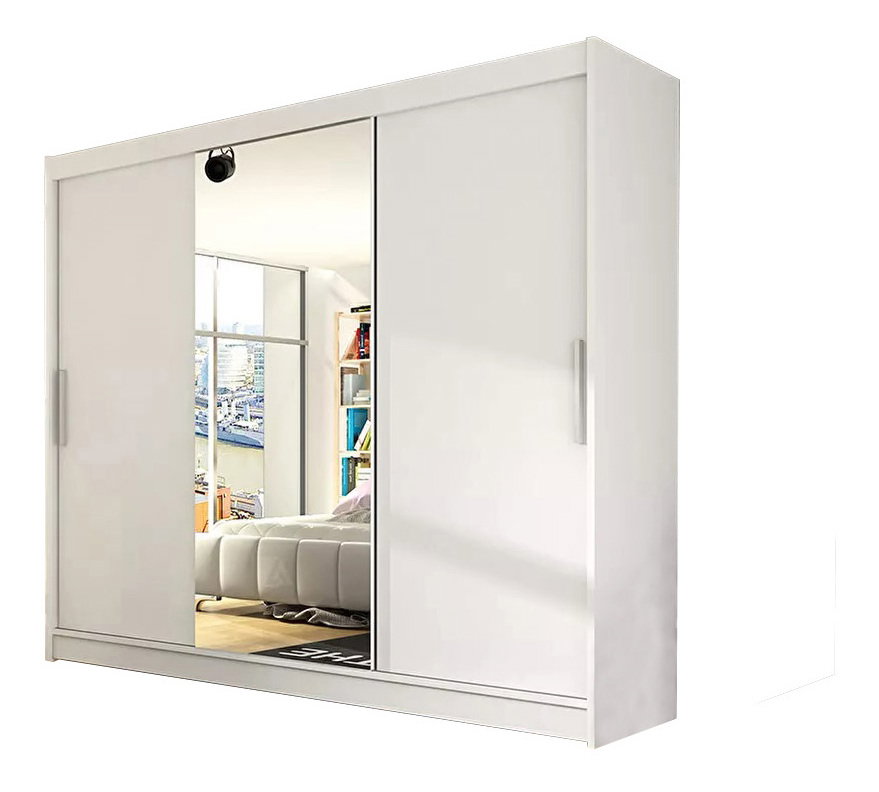 2,5 metrový model šatní skříně Alex se třemi posuvnými dveřmi je již dostupný v naší nabídce. Univerzální barvy dělají z této skříně dokonalý dekorační prvek každého interiéru. Jednoduché a velké zrcadlo opticky zvětší celou místnost a umožní dokonalé přirozené prosvícení místnosti. Vyrobeno z nejkvalitnějších materiálů. Hliníková vodítka, kvalitní ložiska, jsou umístěna ve spodní i horní části dveří, což zajišťuje jednoduchou plynulost otevírání a zavírání. Uvnitř šatní skříně najdete prostor na ramínka, ale také prostorné police na oblečení, ložní textil a mnoho dalších předmětů.