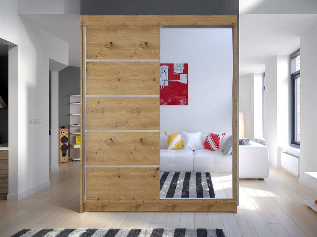 ZobrazitVnitřek této skříně je velmi prostorný tak, že do ní můžete nejen vlastní oblečení, ale i ostatní členy domácnosti. Stylová šatní skříň navzdory svým velkým rozměrům nebude výrazná v interiéru, ale právě naopak. Posuvné dveře šatníku jsou pokryty zrcadlovými panely, díky kterým se interiér místnosti zdá větší, než ve skutečnosti je. Máte rádi, když jsou kusy oblečení správně roztříděny? Bude to možné díky této prostorné šatní skříni, která je vybavena policemi různých velikostí. Na podélnou tyč můžete nasadit ramínka pro formálnější příležitosti.
