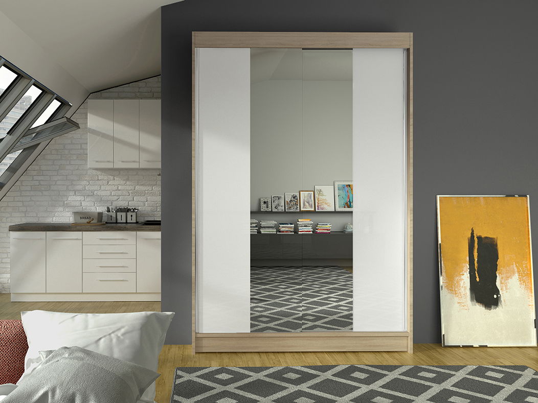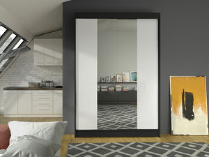 ZobrazitDvoudveřová šatní skříň se systémem posuvných dveří usnadňující každodenní používání. Moderní, funkční a elegantní. Skříň je určena pro bezpečné uložení oděvů a jiných osobních věcí. Ideální do ložnice, obývacího pokoje nebo haly. Skříň má dlouhé vertikální zrcadlo, které jistě potěší každou ženu. Zrcadla menší místnosti navíc opticky zvětší. Standardní vnitřek šatní skříně je na jedné straně tyč a na druhé straně 3 police. Chcete vybudovat větší šatní plochu? K uložení věcí lze využít i vršek skříně.