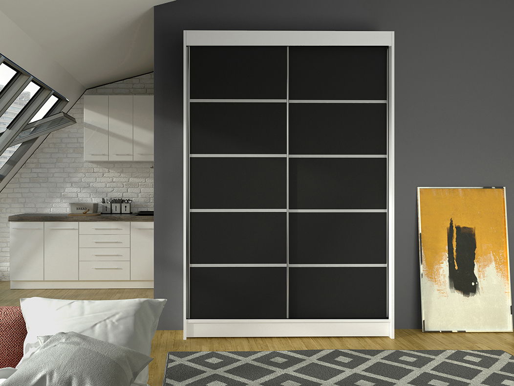 ZobrazitDvoudveřová šatní skříň se systémem posuvných dveří usnadňující každodenní používání. Moderní, funkční a elegantní. Skříň je určena pro bezpečné uložení oděvů a jiných osobních věcí..Ideální do ložnice, obývacího pokoje nebo haly. Standardní vnitřek šatní skříně je na jedné straně tyč a na druhé straně 3 police.Chcete vybudovat větší šatní plochu?K uložení věcí lze využít i vršek skříně.