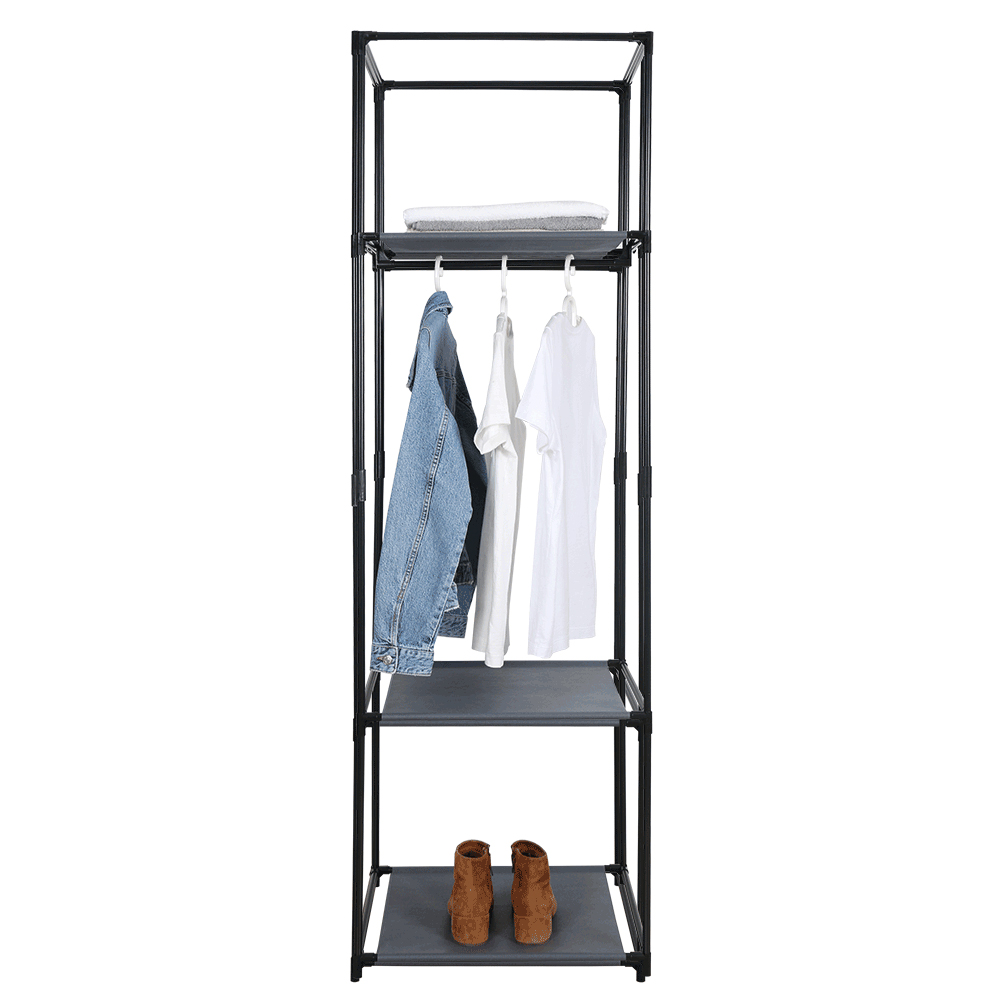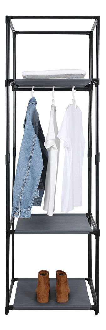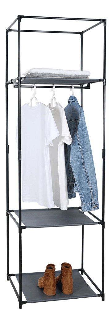 Šatní regál Dům (černá) o výšce 161 cm a hloubce 44 cm nabízí praktické využití v předsíni, šatníku či ložnici. Tento regál je vyroben z kovové konstrukce, což zaručuje jeho pevnost a stabilitu. Je však důležité, aby byl rovnoměrně zatížen. Materiál konstrukce je DTD a poličky jsou potaženy látkou. Nosnost na jednu poličku je 3 kg. Regál obsahuje závěsnou tyč. Upozorňujeme, že regál se dodává v demontu a je třeba jej samostatně sestavit. V případě rovnoměrného zatížení se jedná o praktický a moderní kus nábytku pro vaše oblečení a doplňky.