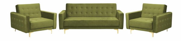 Tato moderní sedací souprava, která se skládá z třímístné pohovky a dvou křesel, se stane pohodlným středem vašeho obývacího pokoje. Je čalouněna velmi kvalitní zelenou sametovou látkou s elegantním prošíváním a nabízí funkčnost a nadčasový design. Díky modulárnímu designu ji lze uspořádat různými způsoby a vytvořit si sedací sestavu šitou na míru. Všechny kusy mají nastavitelná opěradla, která lze sklopit. Celá sestava je stabilní díky kovovým nohám.