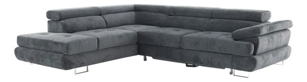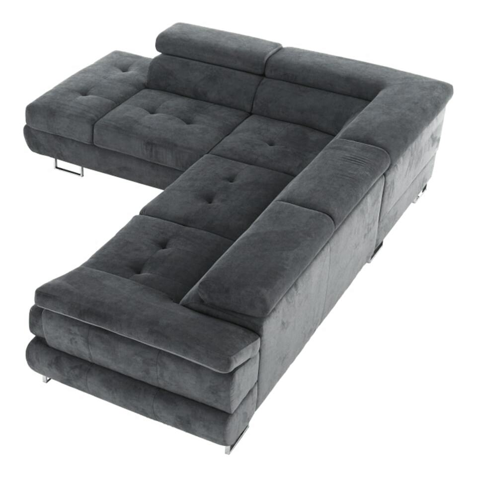 Rohová, Dekorativní prošití, Zajímavá opěrka, 3 polohovací opěrky hlavy, 5 stupňové polohování opěrek, Celočalouněná, Pružinová výplň, Nožičky kovové s povrchovou úpravou chrom, Levé provedení, Dodáváno bez dekorativních polštářků