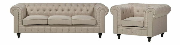 Tato sedací souprava se vyznačuje elegantní siluetou se širokými zaoblenými rameny, která je charakteristická pro design Chesterfield a hodí se do každého moderního nebo tradičně zařízeného interiéru. Nízké opěradlo, tlusté čalouněné sedátko a nohy z eukalyptového dřeva nabízejí ten nejlepší komfort a stabilitu. Kvalitní látkové čalounění v nadčasové béžové je zvýrazněno klasickým prošíváním a knoflíčky. Tato anglická klasika se snadno udržuje a bude vypadat úžasně v tradičně zařízeném nebo moderním interiéru.