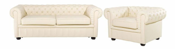 Tato sedací souprava se vyznačuje elegantní siluetou se širokými zaoblenými rameny, která je charakteristická pro design Chesterfield a hodí se do každého moderního nebo tradičně zařízeného interiéru. Nízké opěradlo, tlusté čalouněné sedátko a nohy z dubového dřeva nabízejí ten nejlepší komfort a stabilitu. Kožené čalounění v krémovém odstínu bílé je zvýrazněno klasickým prošíváním a knoflíčky. Tato anglická klasika se snadno udržuje a bude vypadat úžasně v tradičně zařízeném nebo moderním interiéru.