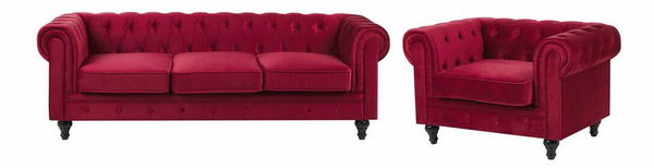Tato sedací souprava se vyznačuje elegantní siluetou se širokými zaoblenými rameny, která je charakteristická pro design Chesterfield a hodí se do každého moderního nebo tradičně zařízeného interiéru. Nízké opěradlo, tlusté čalouněné sedátko a nohy z kaučukového dřeva nabízejí ten nejlepší komfort a stabilitu. Sametové čalounění v tmavém odstínu červené je zvýrazněno klasickým prošíváním a knoflíčky. Tato anglická klasika se snadno udržuje a bude vypadat úžasně v tradičně zařízeném nebo moderním interiéru.