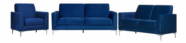 Doplňte interiér touto stylovou sametovou sedací soupravou. Sestává z 3-místné pohovky, 2-místné pohovky a křesla a stane se středobodem vašeho obývacího pokoje nebo pokoje pro hosty. Každý kus je čalouněný modrým sametem a vypadá prvotřídně. Boční opěrky a měkká pěnová výplň se postarají o maximální pohodlí při sezení. Nohy jsou vyrobeny z chromovaného kovu, který zajišťuje výbornou stabilitu. Tato souprava je ideální pro každodenní setkání, malé oslavy nebo lenošení před televizí s rodinou a přáteli.