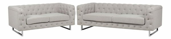 Vylepšete svůj obývací prostor a dodejte mu půvab s touto čalouněnou sedací soupravou, která se skládá z 2-místné a 3-místné pohovky. Její elegantní design, který je inspirován stylem Chesterfield v kombinaci se stylem tuxedo, se hodí do každého moderního, ale i tradičně zařízeného interiéru. Sedací souprava s kvalitním béžovým čalouněním má nohy z nerezavějící oceli, tlusté sedací polštáře pro lepší komfort a výrazné prošívání s knoflíky.